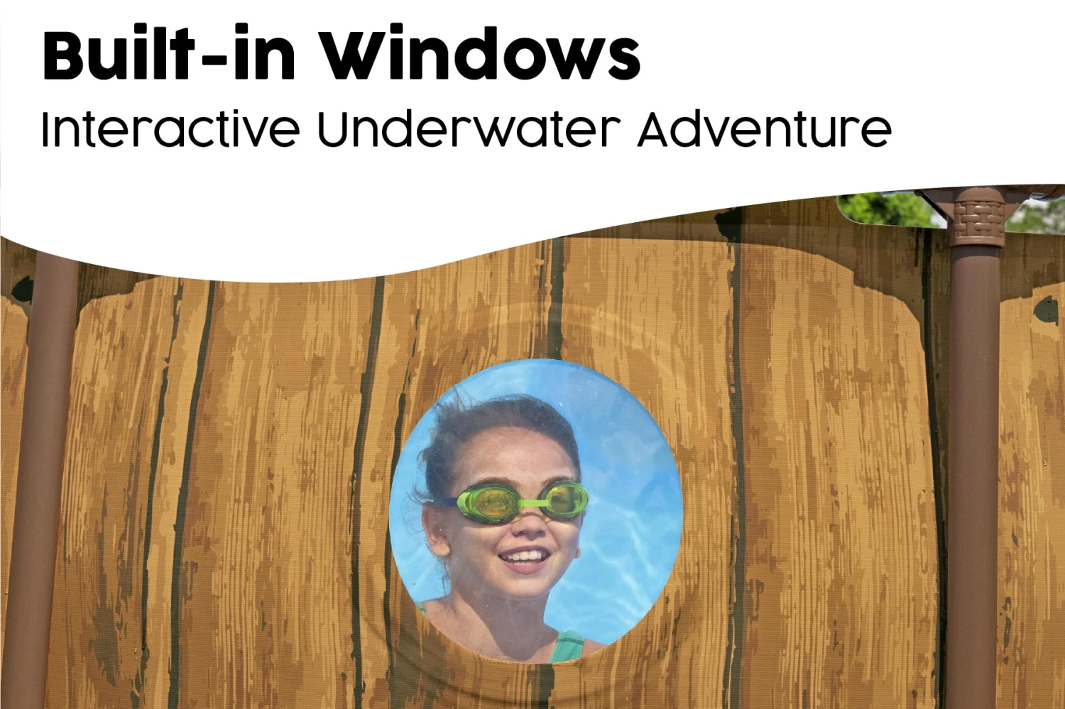 The Bestway® Steel Pro MAX™ Splashview™ 14ft pool set offers a truly unique pool experience for kids and families. With reinforced, fortified porthole windows built into the sides of the pool, swimmers can wave and make silly faces as they swim by underwater. ///