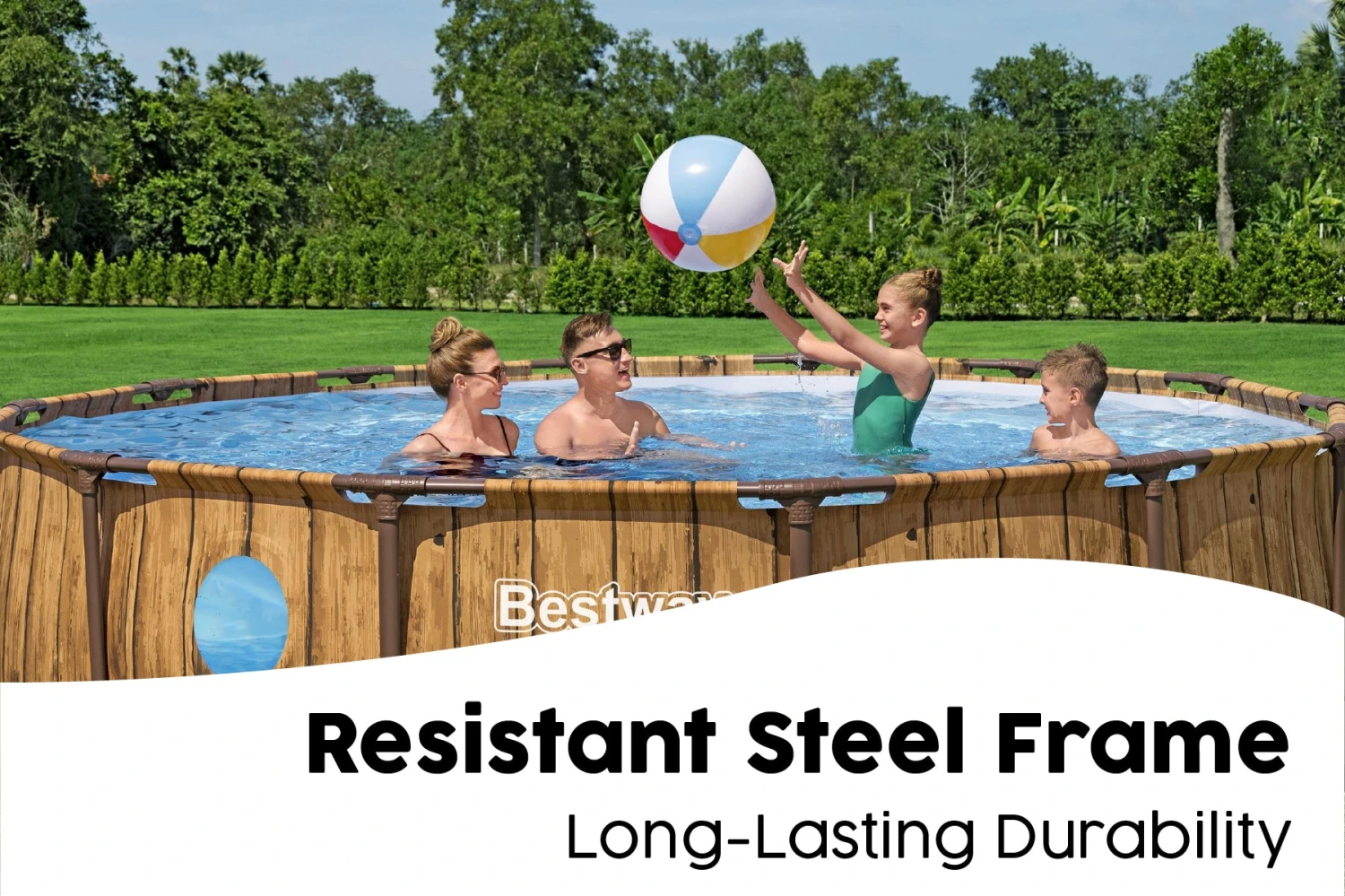 The durable pool frame is constructed with superior corrosion-resistant steel to ensure stability and longevity. The ClickConnect™ joints make setting up the family pool a total breeze, with no additional tools or accessories needed. The frame connectors also prevent metal-on-metal contact to ensure rust resistance.