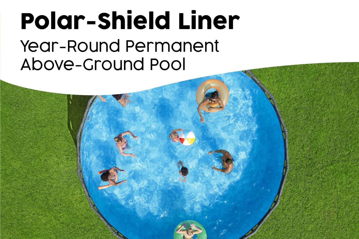 The first of its kind in the above ground pool market, APX 365 pools are equipped with Polar-Shieldâ„¢ weather defence technology. You can set up the round family pool in the summer, then leave it up through the winter – no off-season storage needed! Polar-Shield protects the liner against outdoor elements, even in super cold temperatures.