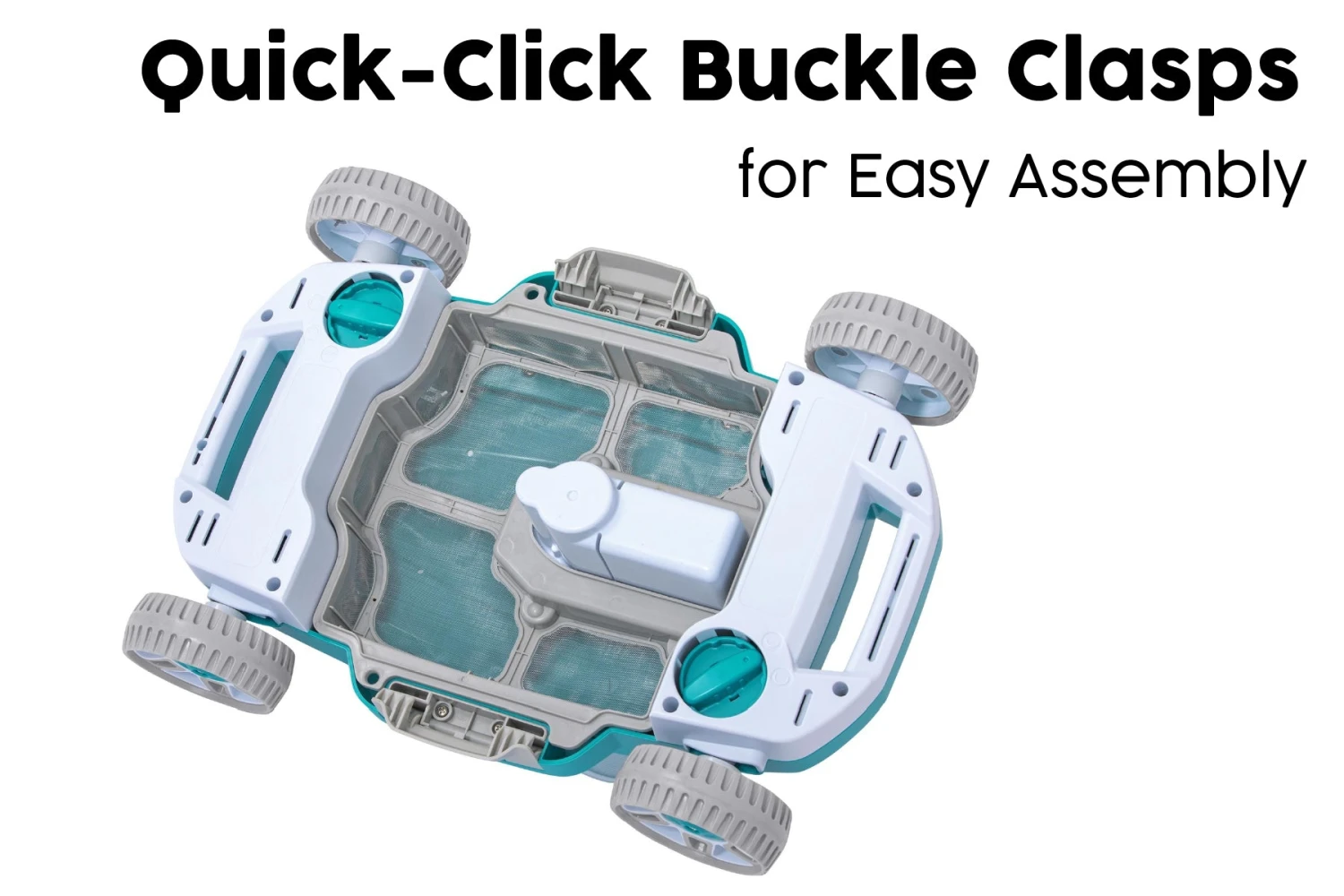 - This cordless pool vacuum operates for 90 minutes with a quick charge time of 5–6 hours. Includes quick click buckle clasps for easy setup and maintenance.