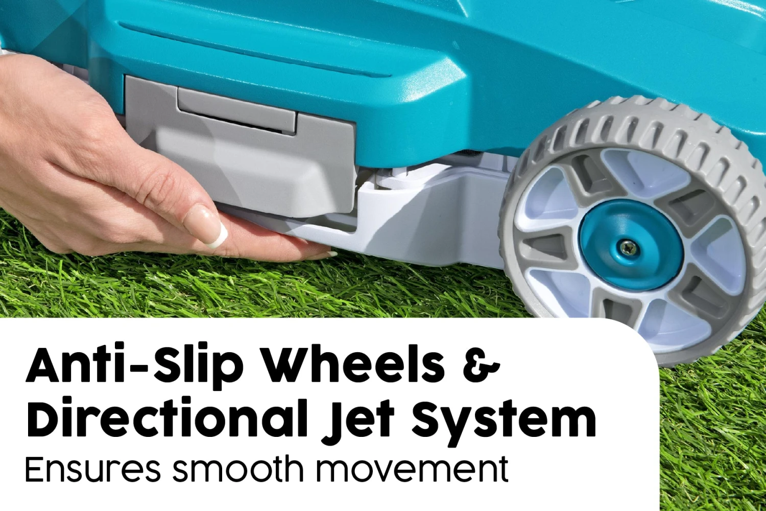 - The anti-sleep wheels with directional jet system that changes direction when it encounters walls or larger obstacles. This minimises risks and ensures more efficient cleaning time