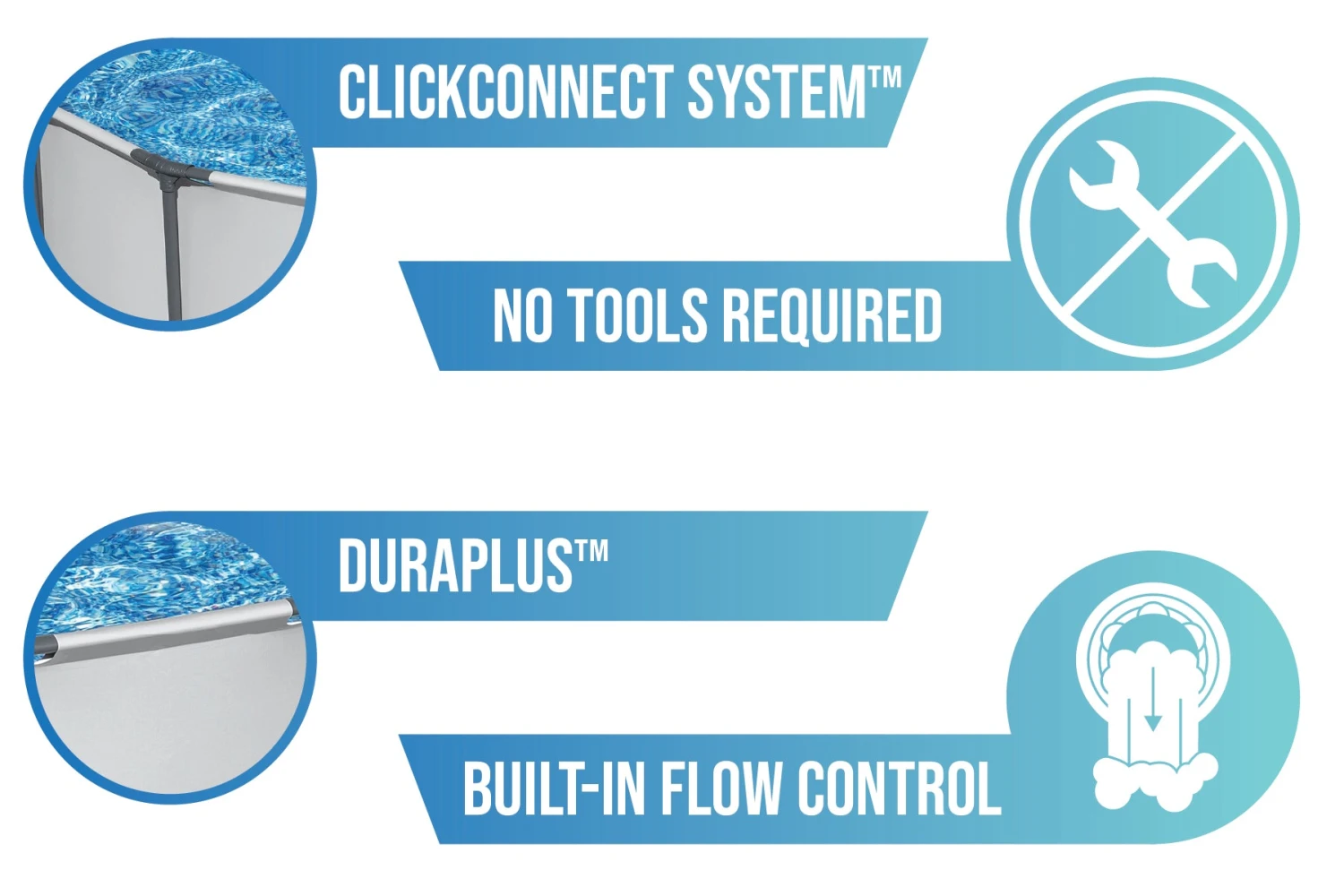 The ClickConnect Systemâ„¢ of frame connectors makes setting the pool up a breeze, with no additional tools or accessories needed. Quickly click each support piece into place for a safe and secure connection.