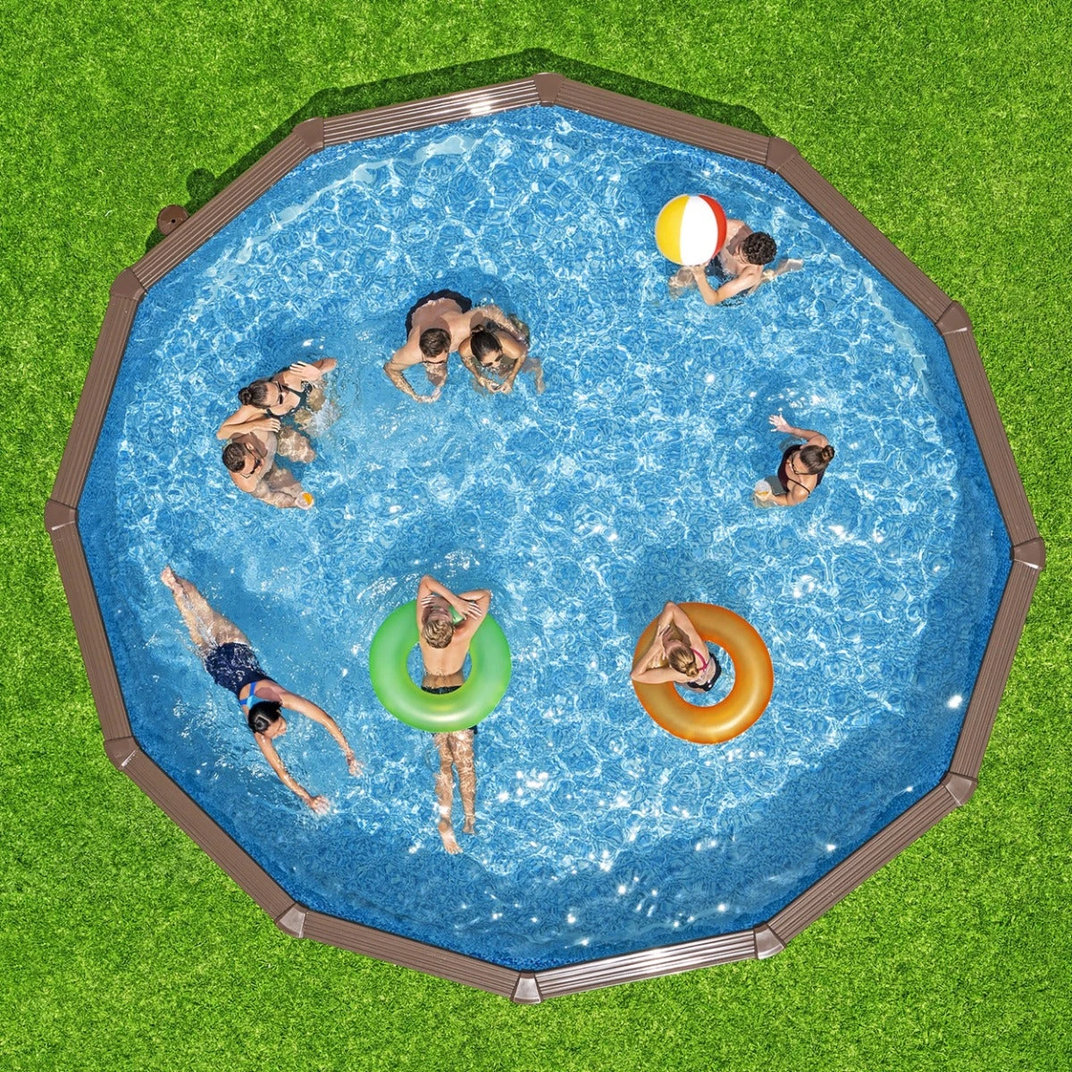 The round 18ft Bestway® Hydrium™ Steel Wall Above Ground Pool Set is perfect for families looking for a more affordable, year‑round outdoor pool. ///
