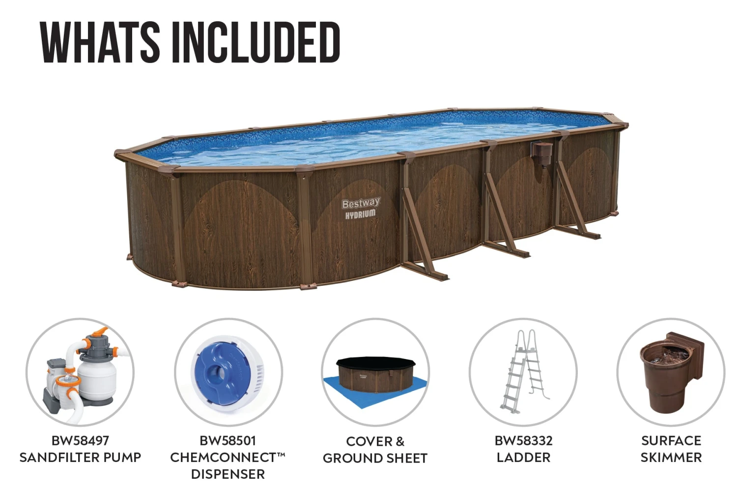 The oval 24ft Bestway® Hydrium™ Steel Wall Above Ground Pool Set is perfect for families looking for a more affordable, year‑round outdoor pool. ///