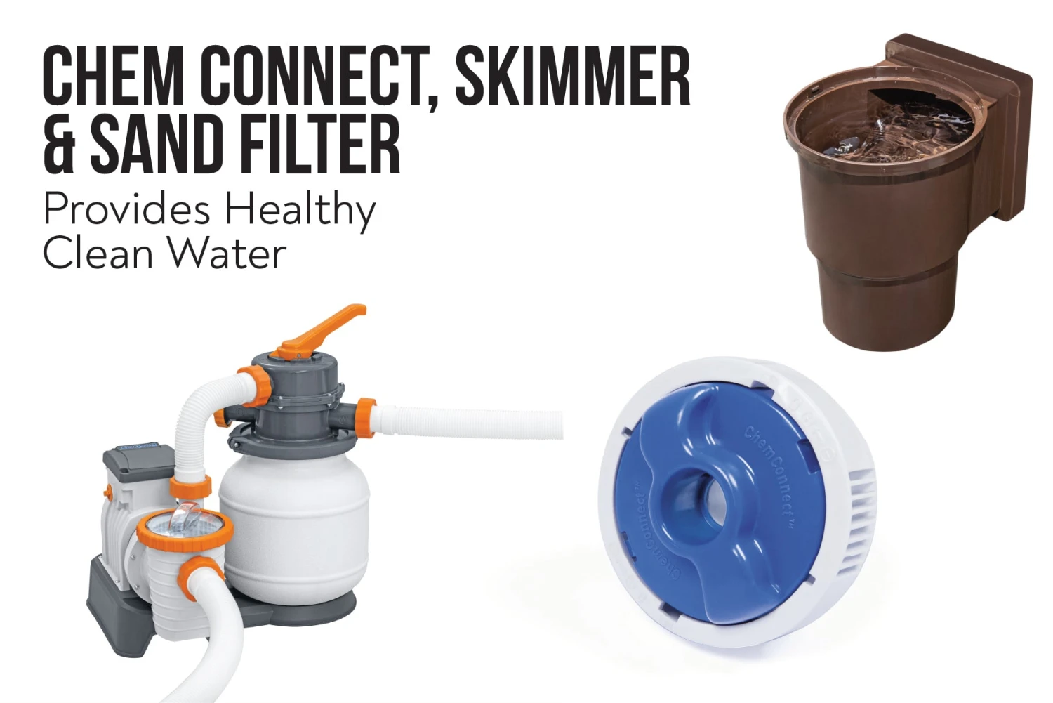 This pool set comes with a sand filter, a built‑in surface skimmer, a ladder, a ground cloth, a pool cover and a ChemConnectâ„¢ chemical dispenser. The sand filter is a good alternative to a traditional cartridge filter pump with a longer lifespan, and the surface skimmer attaches to the side of the pool to work with the filter to remove unwanted debris from the water.Â