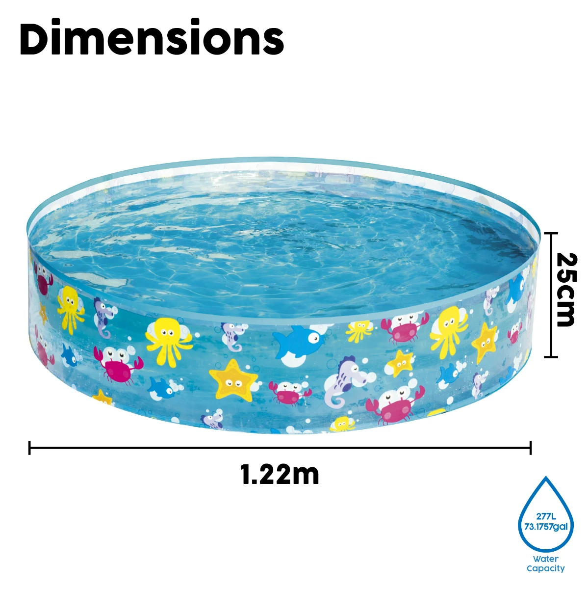 - Simply fold out the durable vinyl outer wall and fill with water.