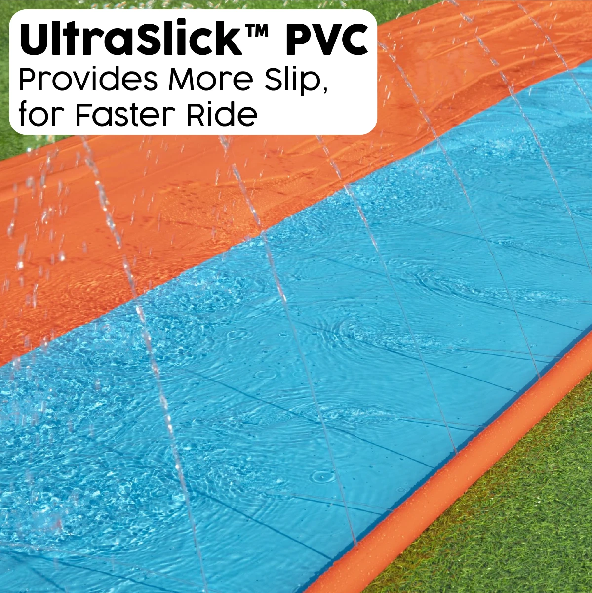 - The double slipnslide features built-in sprinklers that provide water coverage to maximise sliding, spraying and splashing fun