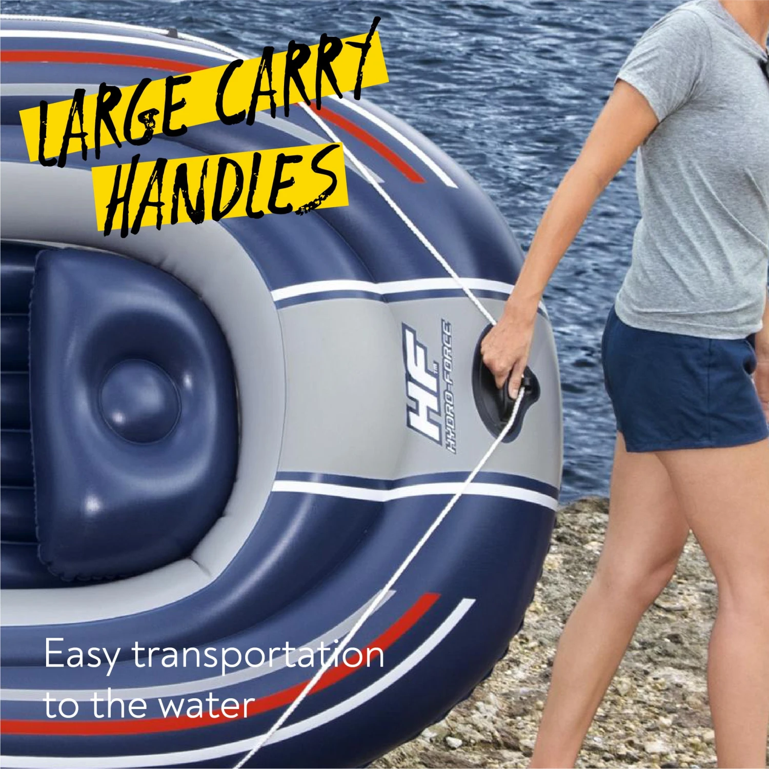 - Durable PVC construction with wrap-around grab rope with built-in grommets plus heavy-duty handle and the tow ring for convenience