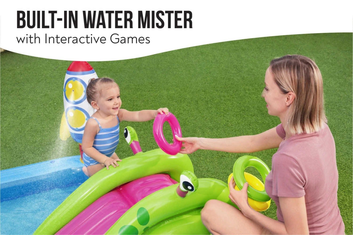 - Easy set up simply attach to garden hose for hours of splashing fun. Allowing your child to dive into a world of imagination and aquatic enjoyment instantly.