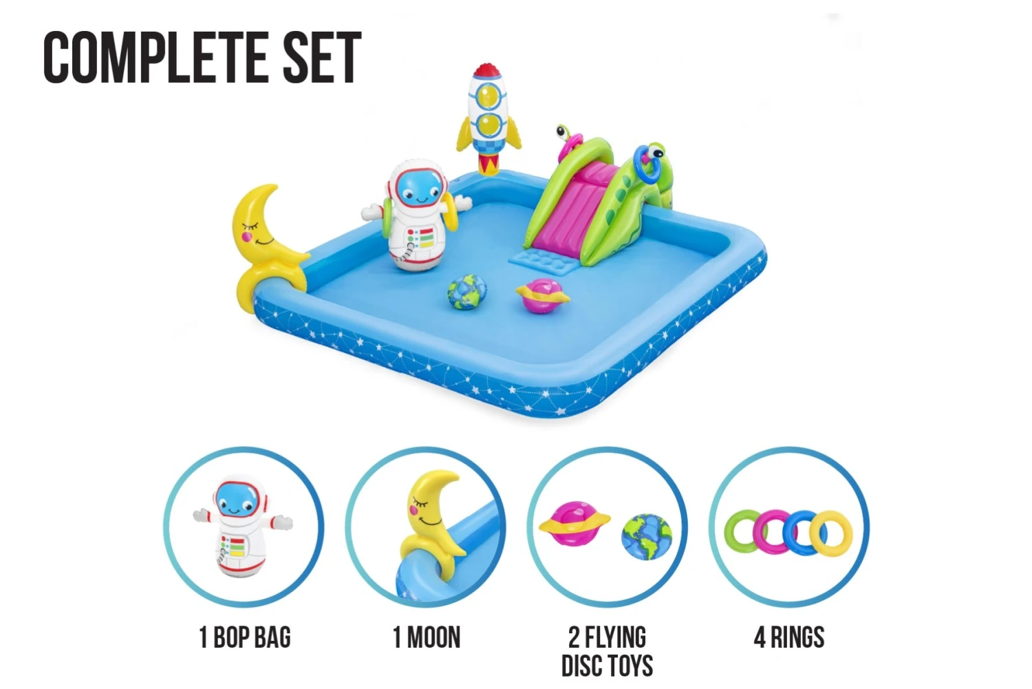 - Astronaut bop bag, Moon ring toss game and 2 planet flying disc toys! This interactive paddling pool will provide your kids with endless hours of fun!