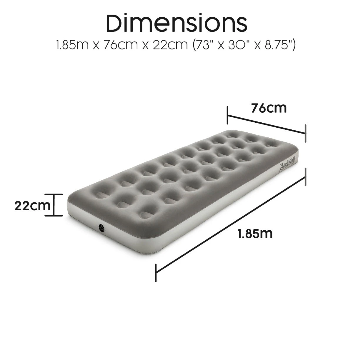 Experience comfort on the go with the Bestway® Flocked Single Airbed. Designed for indoor and outdoor use, this convenient double airbed is perfect for a spare room or campaign trips as it is incredibly compact when deflated, inflates and deflates quickly, and gives a comfortable night’s sleep. ///