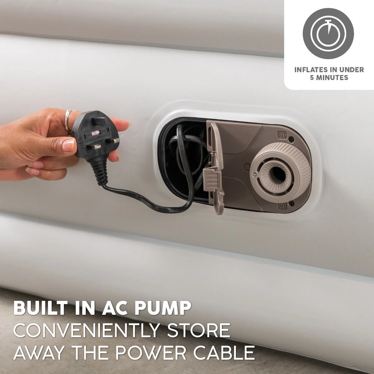 - Built-in 220-240v electric pump that quickly inflates and deflates the air mattress in under 5 minutes and includes storage for the power cable