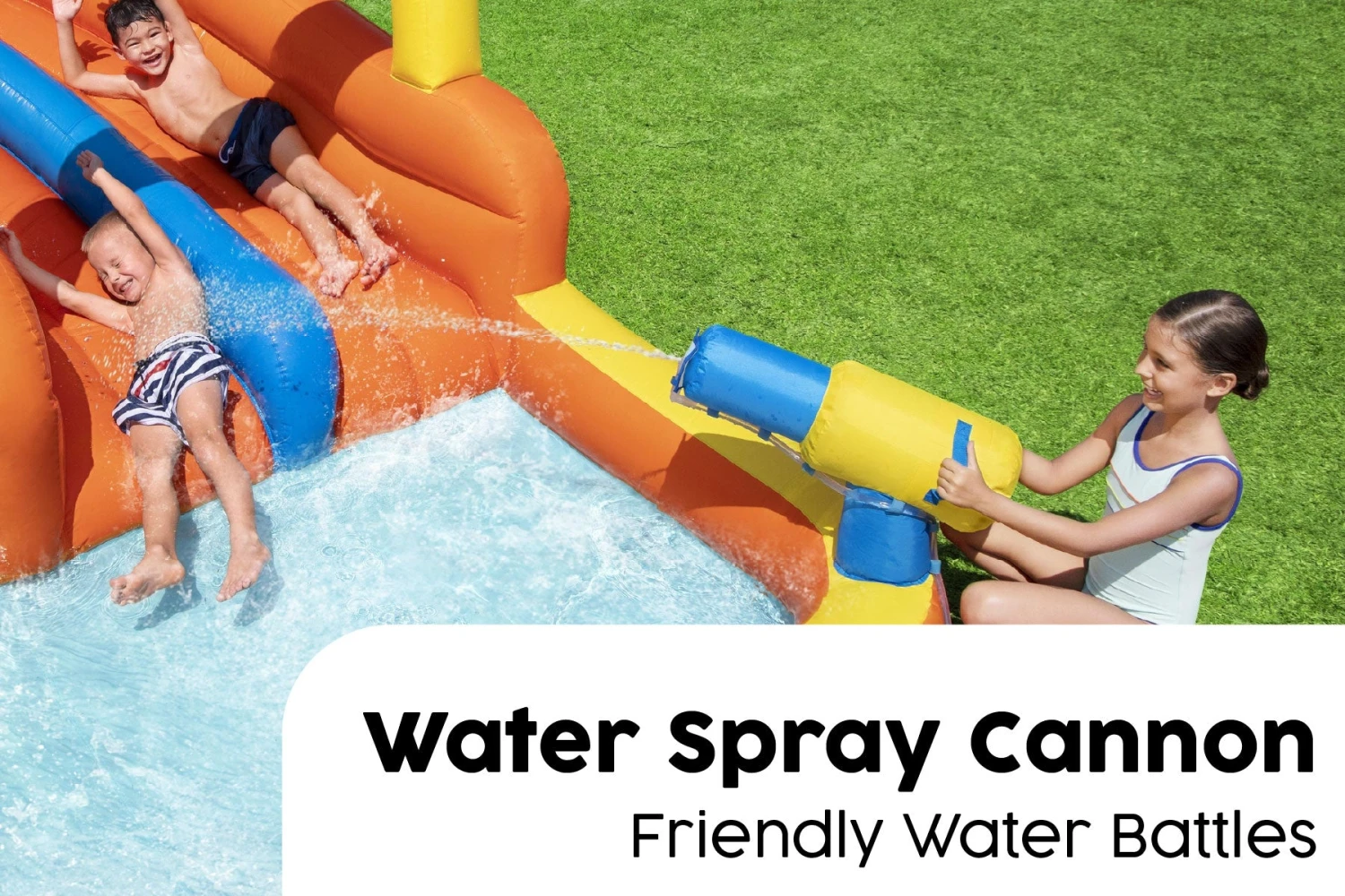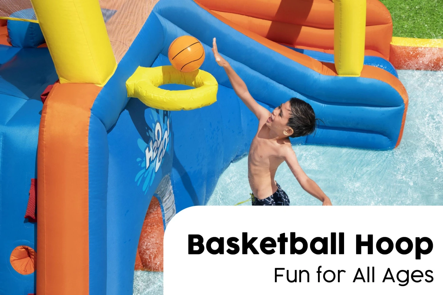 - Transform your garden into an action packed inflatable water park, complete with a dual lane slide, splash pool, water tunnel, spray cannon and basketball hoop for hours of active outdoor playÂ