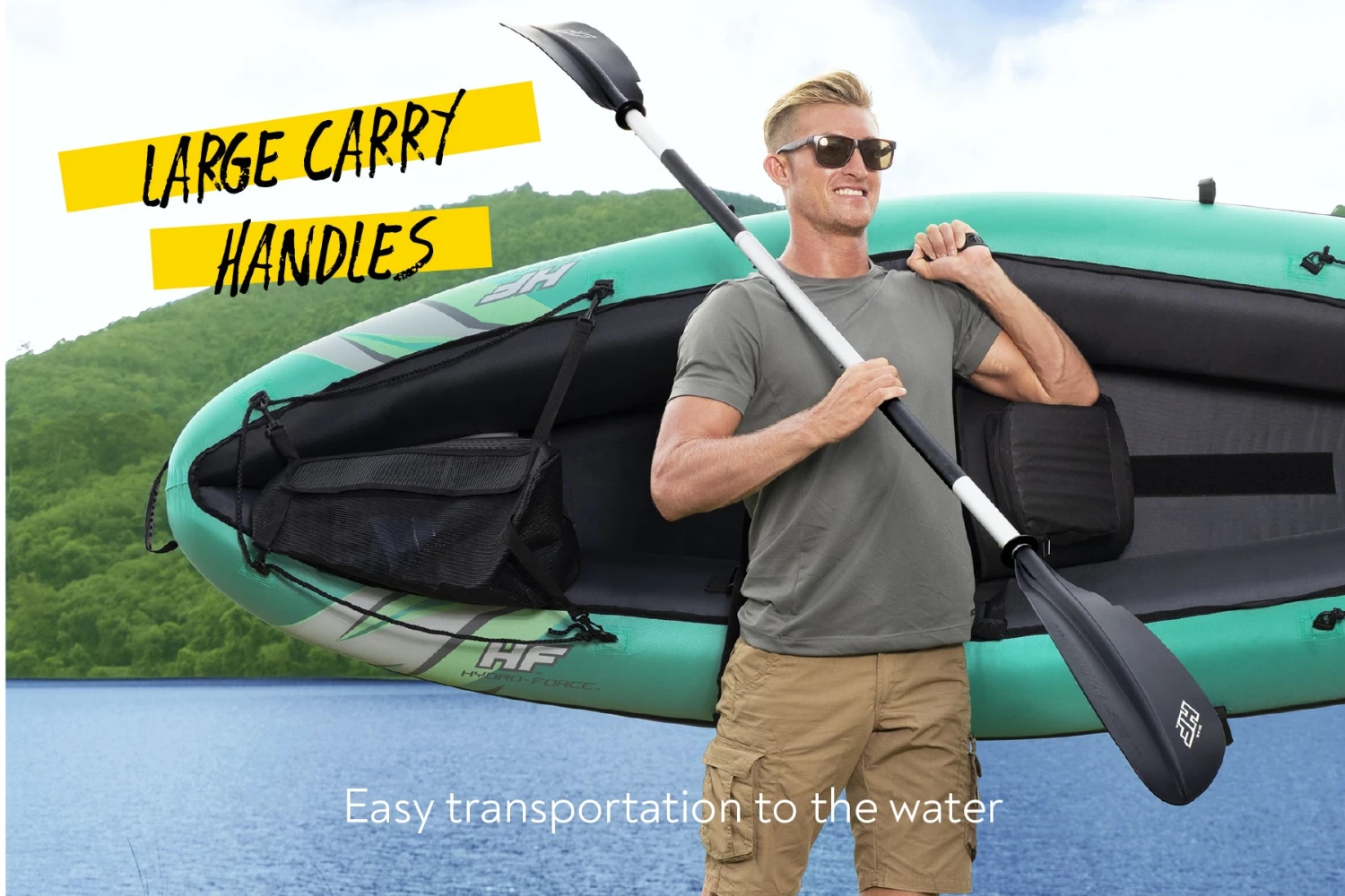Designed with an adjustable backrest for comfort and support, this single-seat kayak can fit your essentials like snacks and water in an easily accessible storage compartment below each seat. Ther is also a removable storage bag that allows you to access your necessities as you paddle through the water. The double-bladed oar is aluminium, lightweight, and held flush to the kayak by secure oar clasps. It has sturdy canvas handles on each side, which makes moving the kayak a breeze.