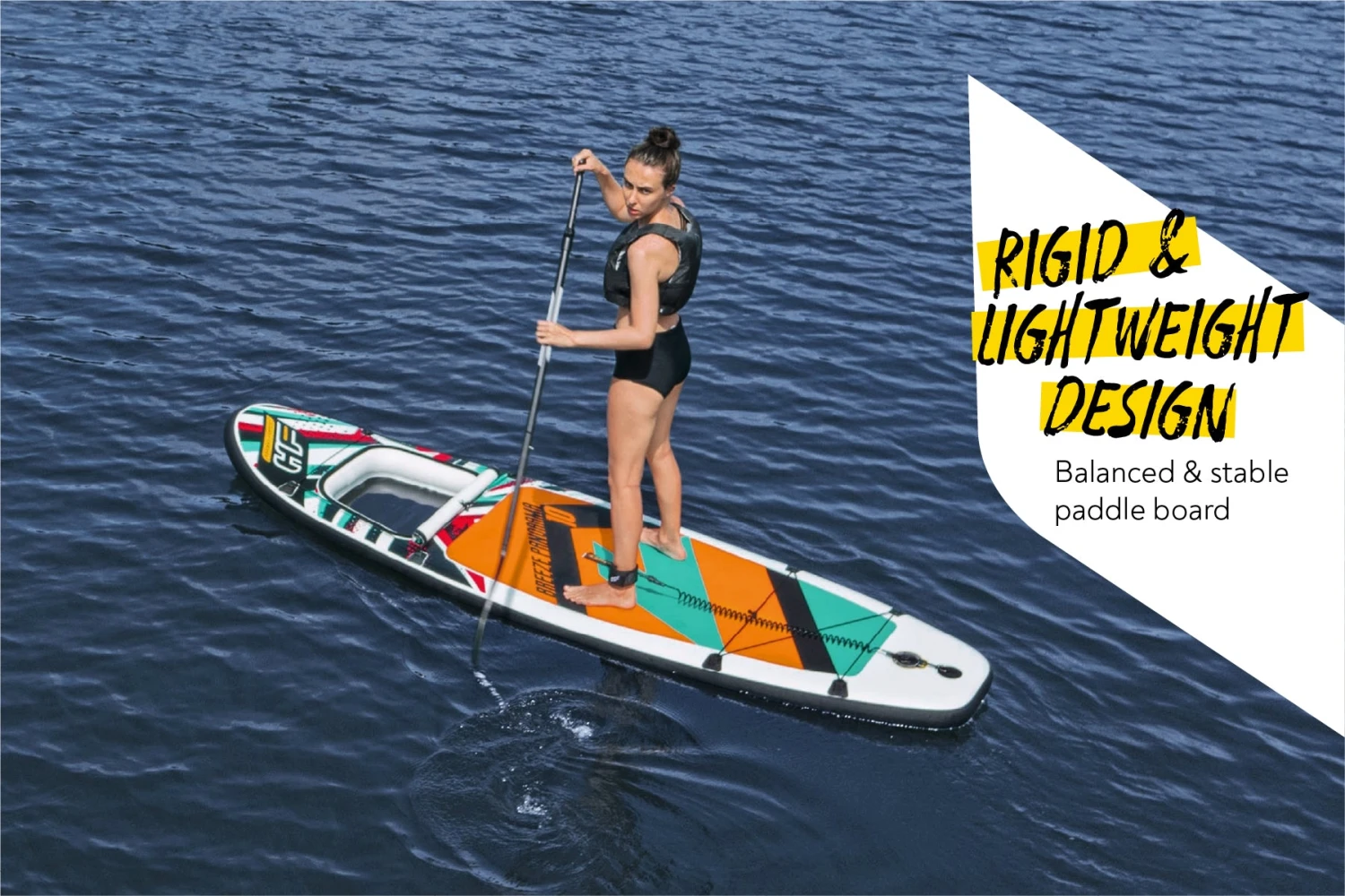 Designed for strength, stability, and control on the water, this all round inflatable paddle board’s internal drop stitch construction connects the top and bottom of the board with thousands of fibers which provides similar rigidity to a hard-sided board but with much easier storage and transportation and can support up to 110kg. The inflatable SUP has a highly durable, UV & puncture-resistant TriTechâ„¢ surface material able to withstand many adventures out on the water.