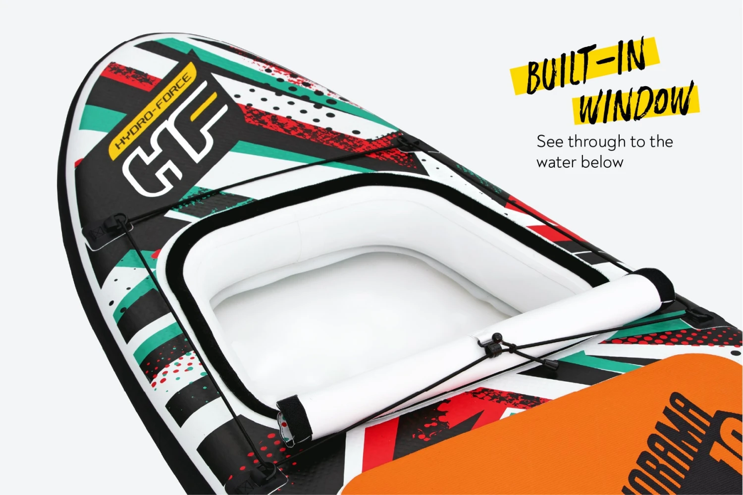 The Hydro‑Force™ Breeze Panorama™ inflatable stand‑up paddle board set is ready for water exploration. The all round paddle board has a built‑in window, with a retractable cover, that offers a unique experience on the water where can see through to the water below, and gaze at the fish and other aquatic animals as they swim by. ///