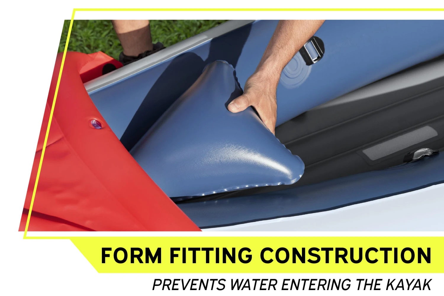 The kayak includes three adjustable inflatable seats with backrests, two removable fins for stability, and a form-fitted cockpit to keep water out. It also features heavy-duty carry handles, a carry bag, aluminium paddles, and a pump, making it perfect for versatile water adventures.
