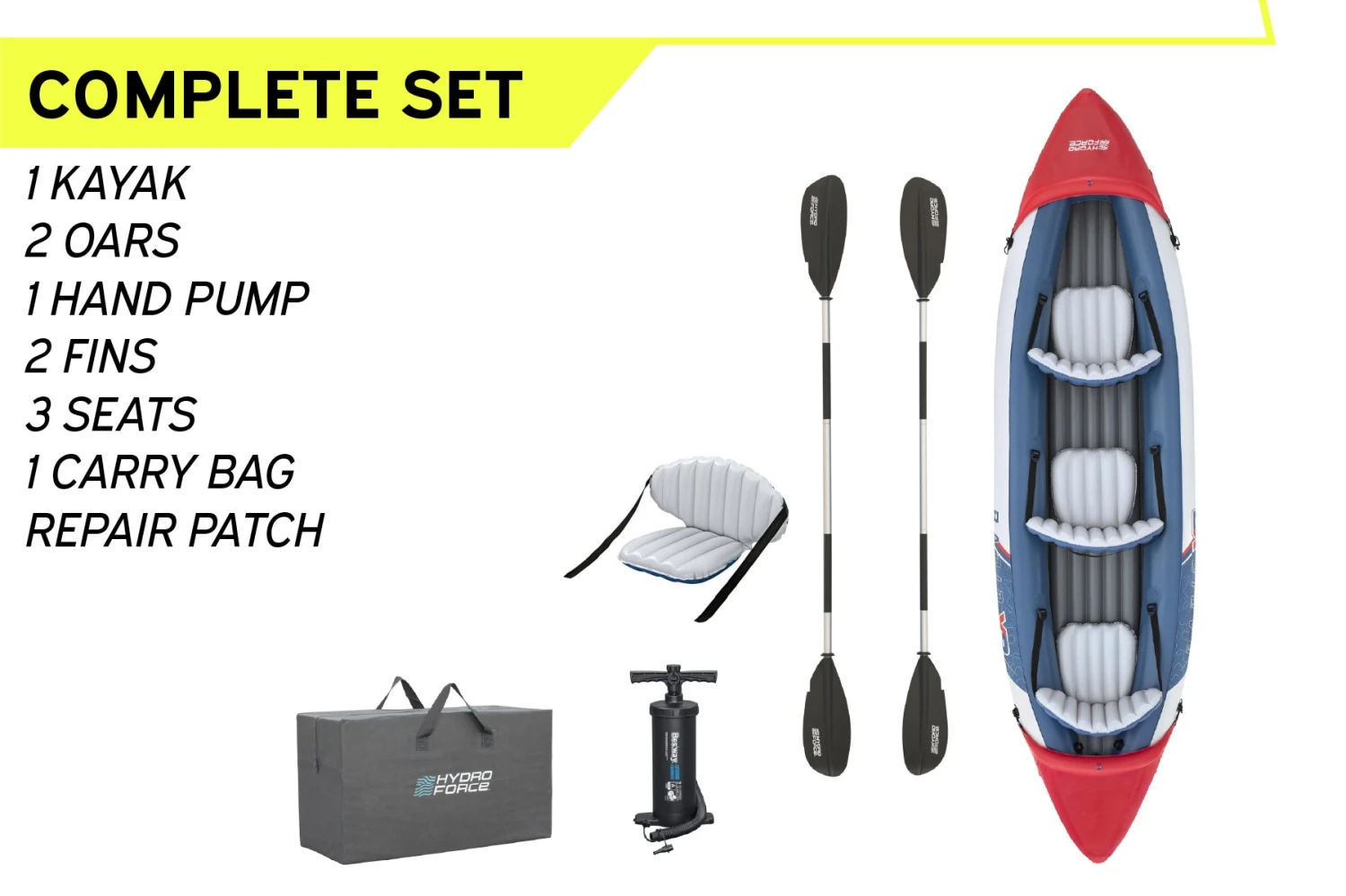 The Hydro Force® Rapid X3 is a 3-person inflatable kayak, designed for easy transport and adventure. It has a 280 kg (617 lbs) weight capacity and inflates/deflates quickly for convenience. Made with Inflata-Shield Pro™ material, it is puncture-resistant, rigid, and retains air well. ///