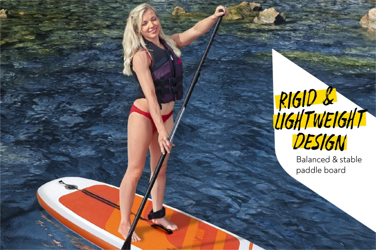 With everything you need in one complete package, it’s easy to get out on the water and have some fun. Designed to offer optimum strength, stability, and control when you are out on the water, the Aqua Journey has a drop stitch construction that can support up to 100kg while offering similar rigidity to a hard-sided board but with much easier storage and transportation. The beginners SUP has a highly durable, UV resistant and puncture-proof TriTech™ surface material able to withstand many adventures out on the water.