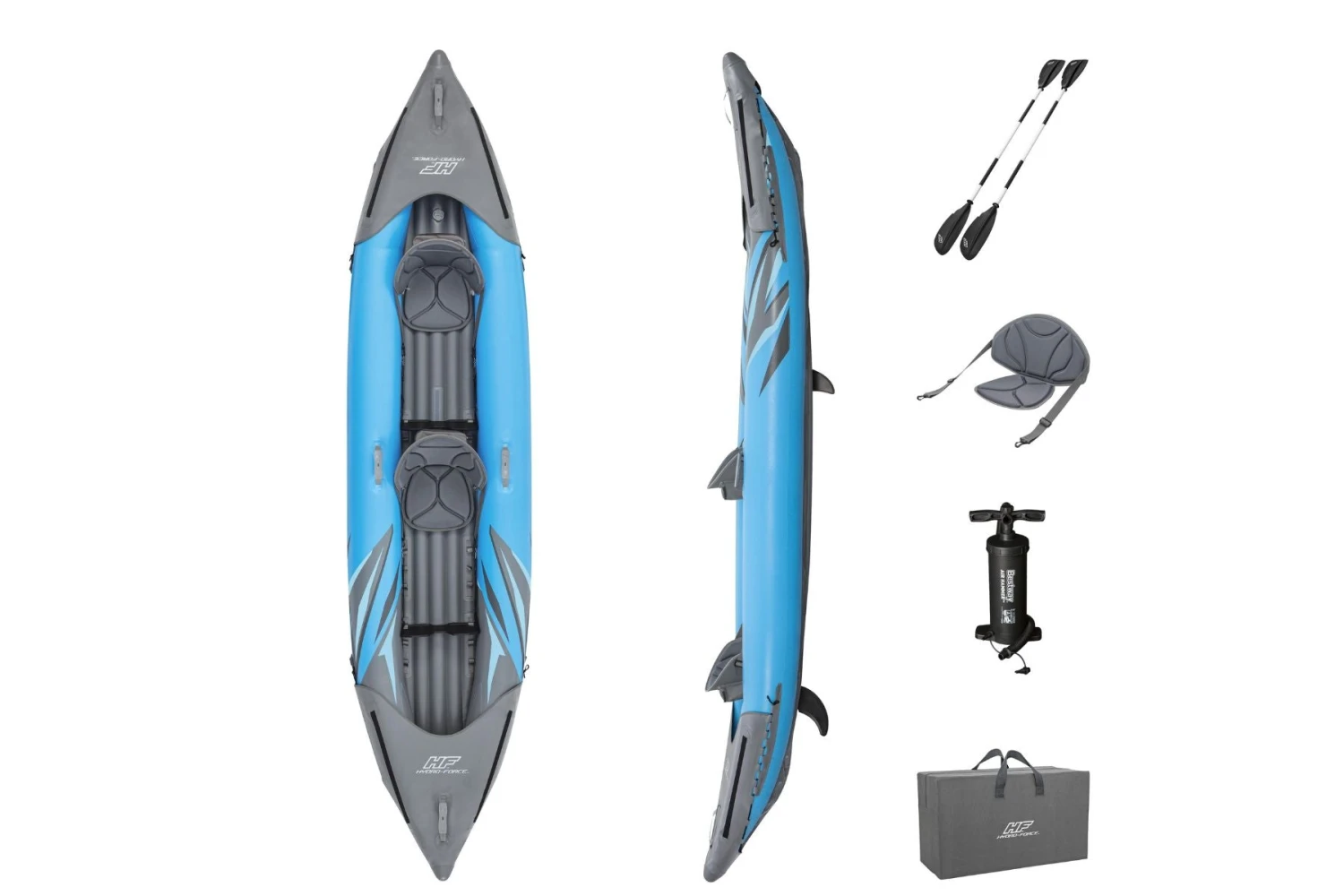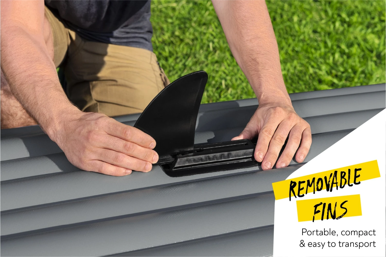 Enjoy the ride even more thanks to the supportive backrests, raised seats and footrests. This kayak set includes 2 paddles, a pump, and 2 removable fins in different sizes for directional support in various water conditions, so you have everything you need for your next trip.