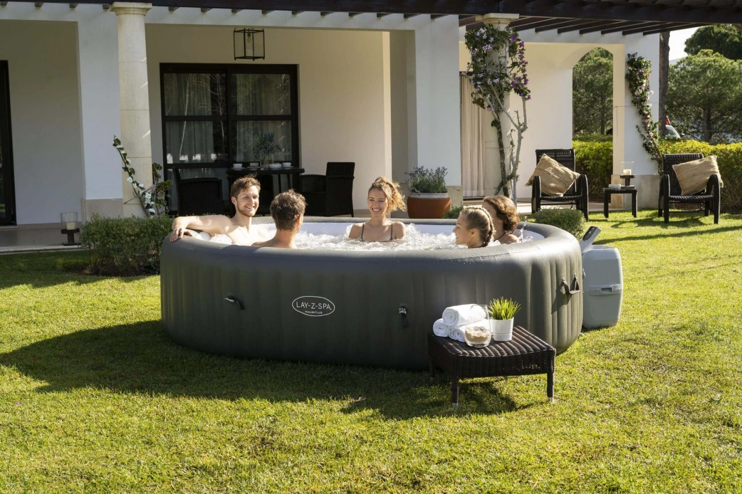 Relax and unwind at home and enjoy positive benefits to health and wellbeing with the Lay-Z-Spa Mauritius Smart AirJet™, a 7-person oval-shaped inflatable hot tub with WiFi.