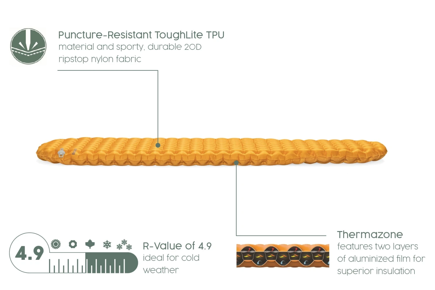 - The R Value of the sleeping pad is 4.9 ideal for cold weather conditions, it will effectively block the cold from the ground, keeping you cozy and warm throughout the night!